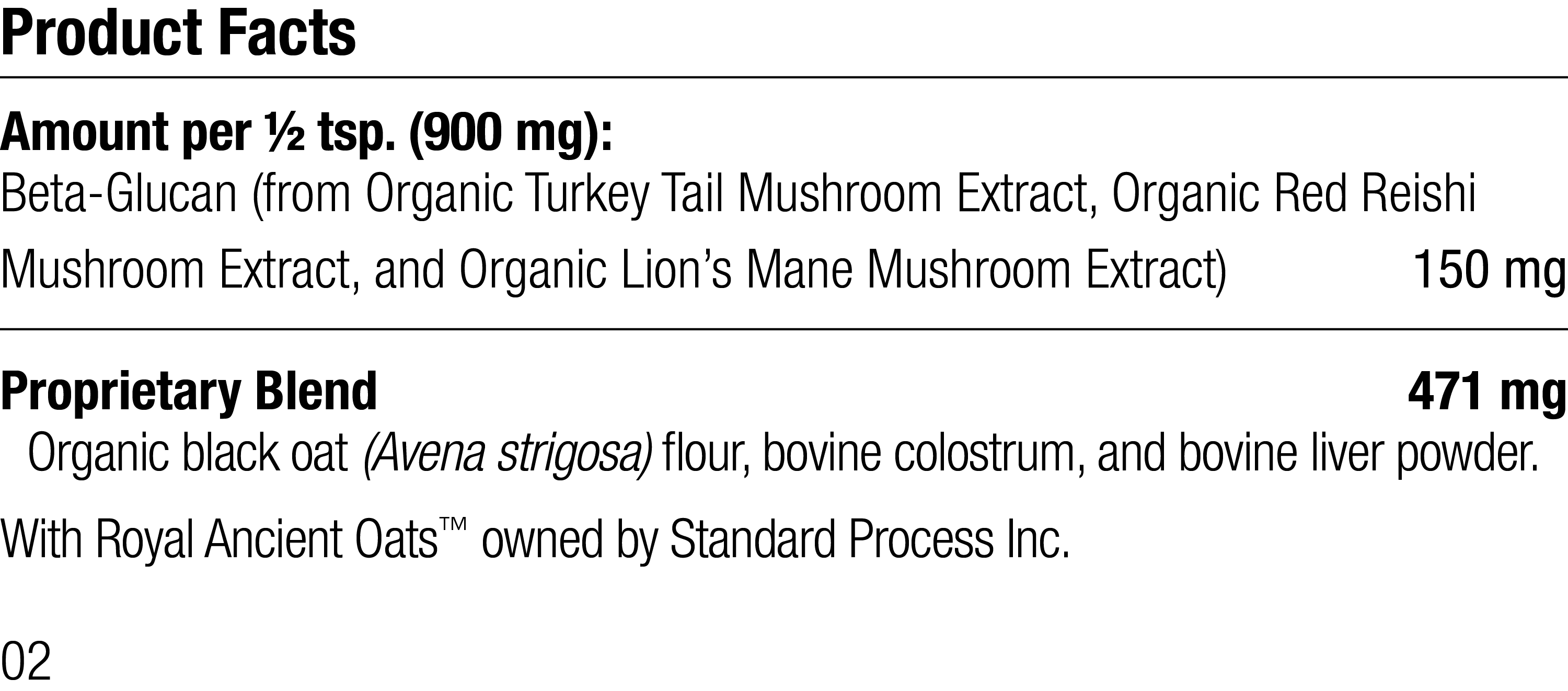 Amount per 1/2 tsp. (900 mg): Beta-Glucan (from Organic Turkey Tail Mushroom Extract, Organic Red Reishi Mushroom Extract, and Organic Lion’s Mane Mushroom Extract) 150 mg